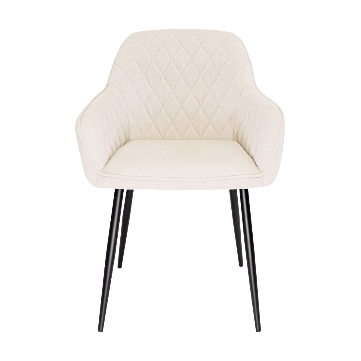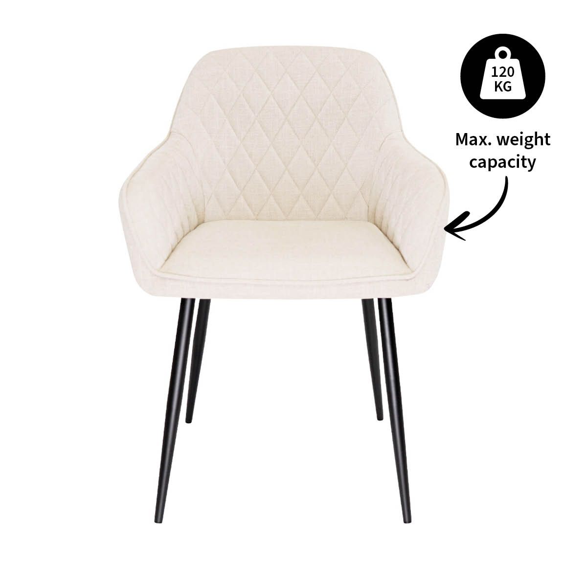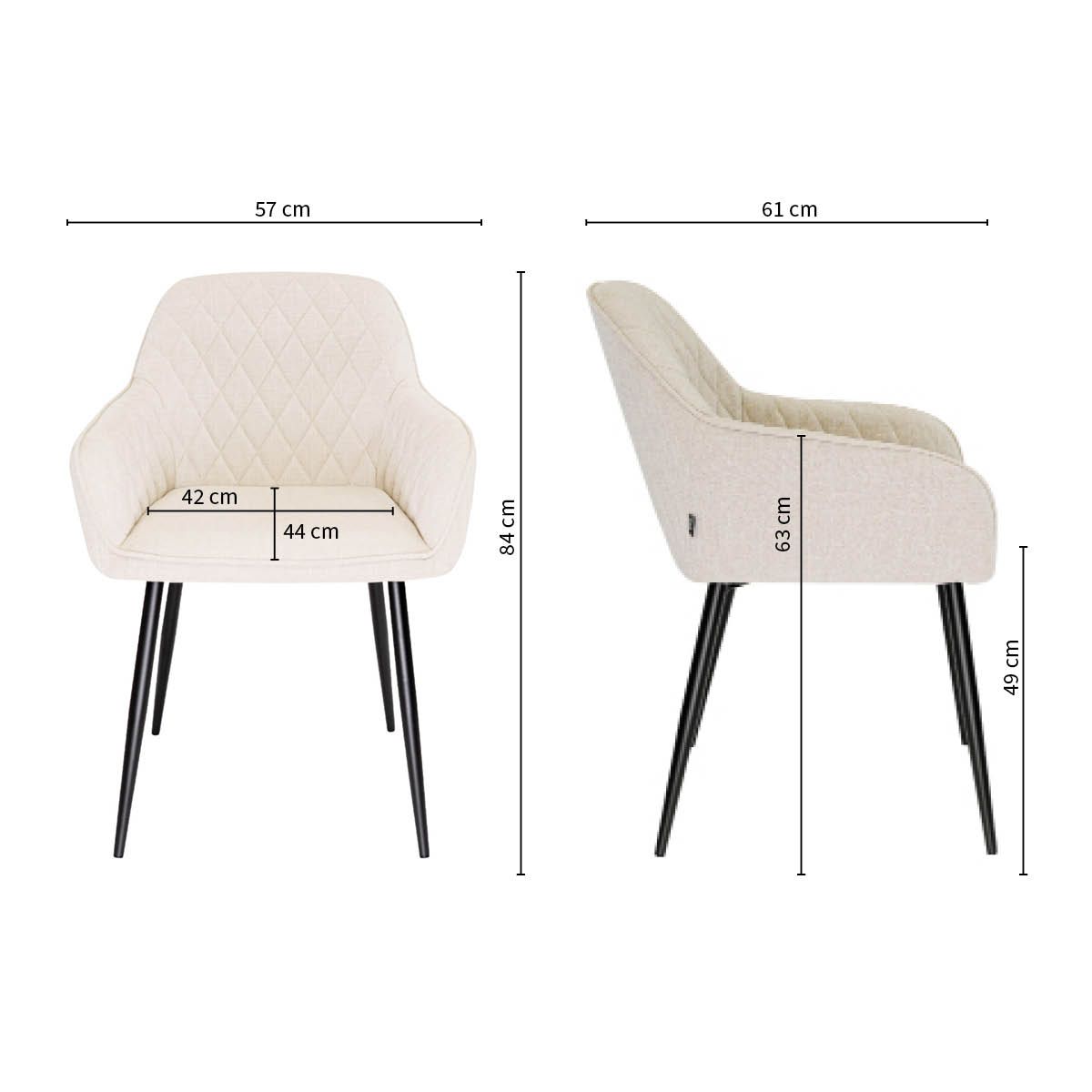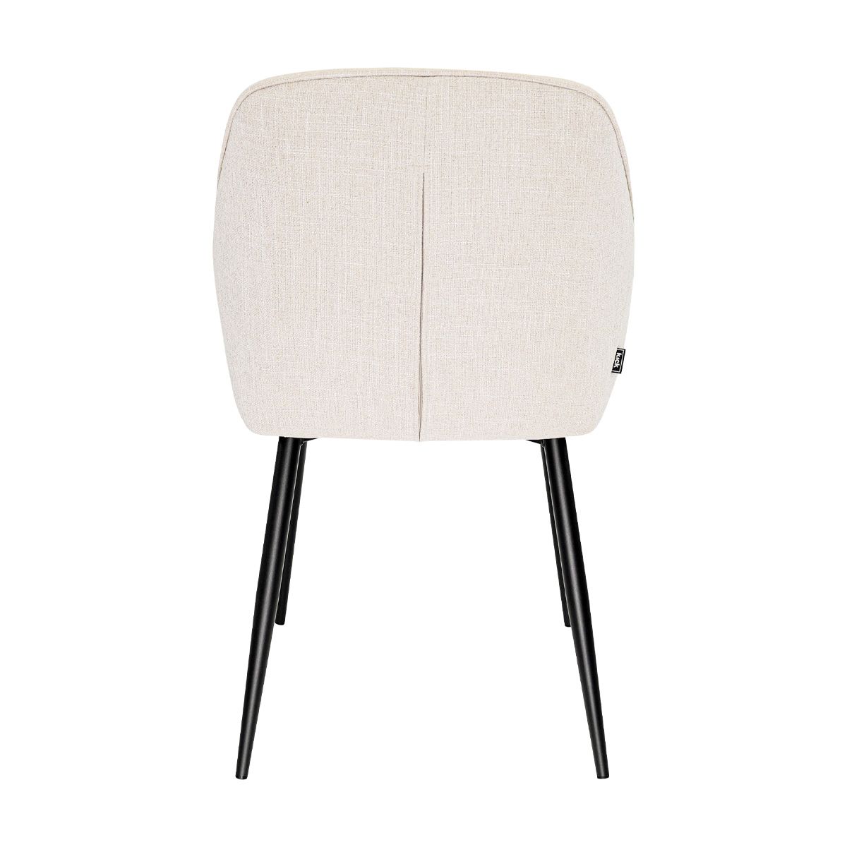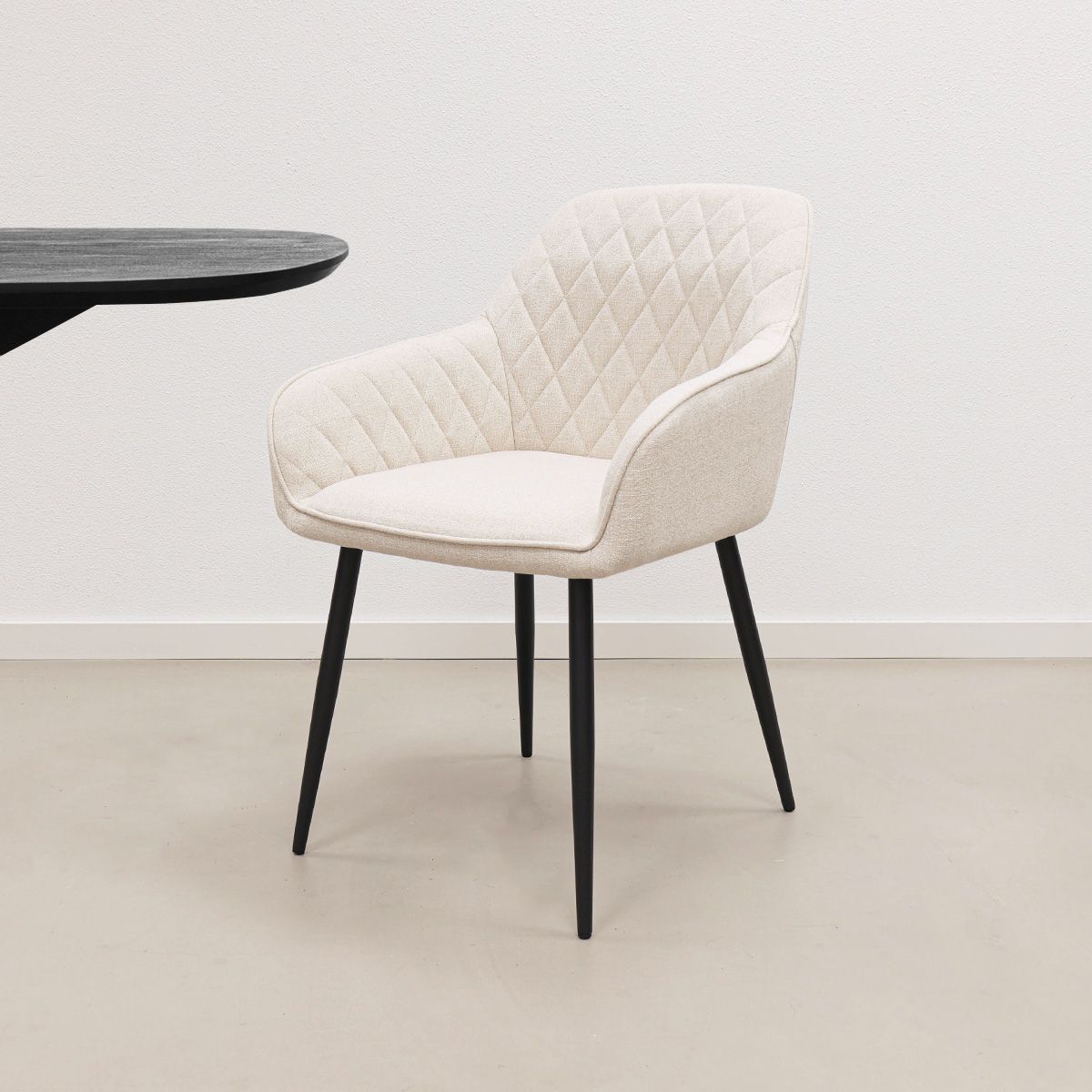 The rounded armrests ensure comfortable and inviting seating, while the sturdy backrest provides optimal support during long dinners. The stitching in a playful diamond pattern on the backrest adds a subtle but striking detail. The piping along the backrest and armrests enhances the luxurious character and gives the chair a refined finish. The fine textured fabric feels soft and contributes to the comfortable, high-quality seating experience.