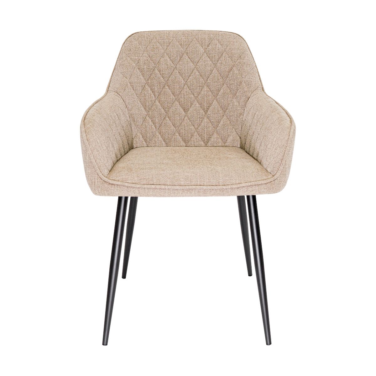 The rounded armrests ensure comfortable and inviting seating, while the sturdy backrest provides optimal support during long dinners. The stitching in a playful diamond pattern on the backrest adds a subtle but striking detail. The piping along the backrest and armrests enhances the luxurious character and gives the chair a refined finish. The fine textured fabric feels soft and contributes to the comfortable, high-quality seating experience.