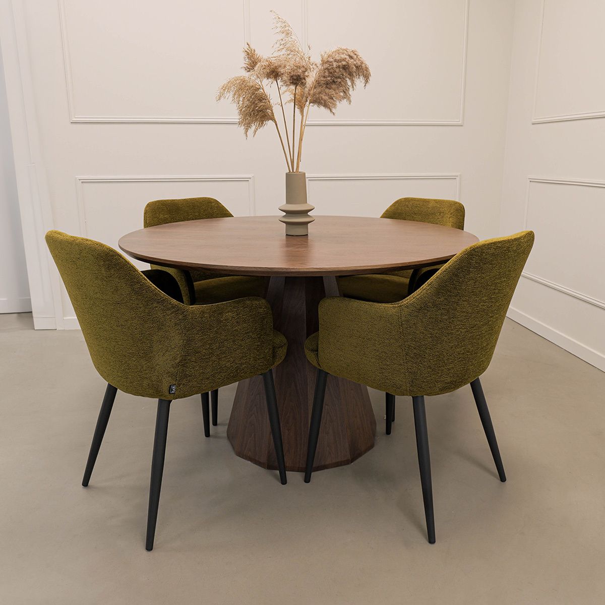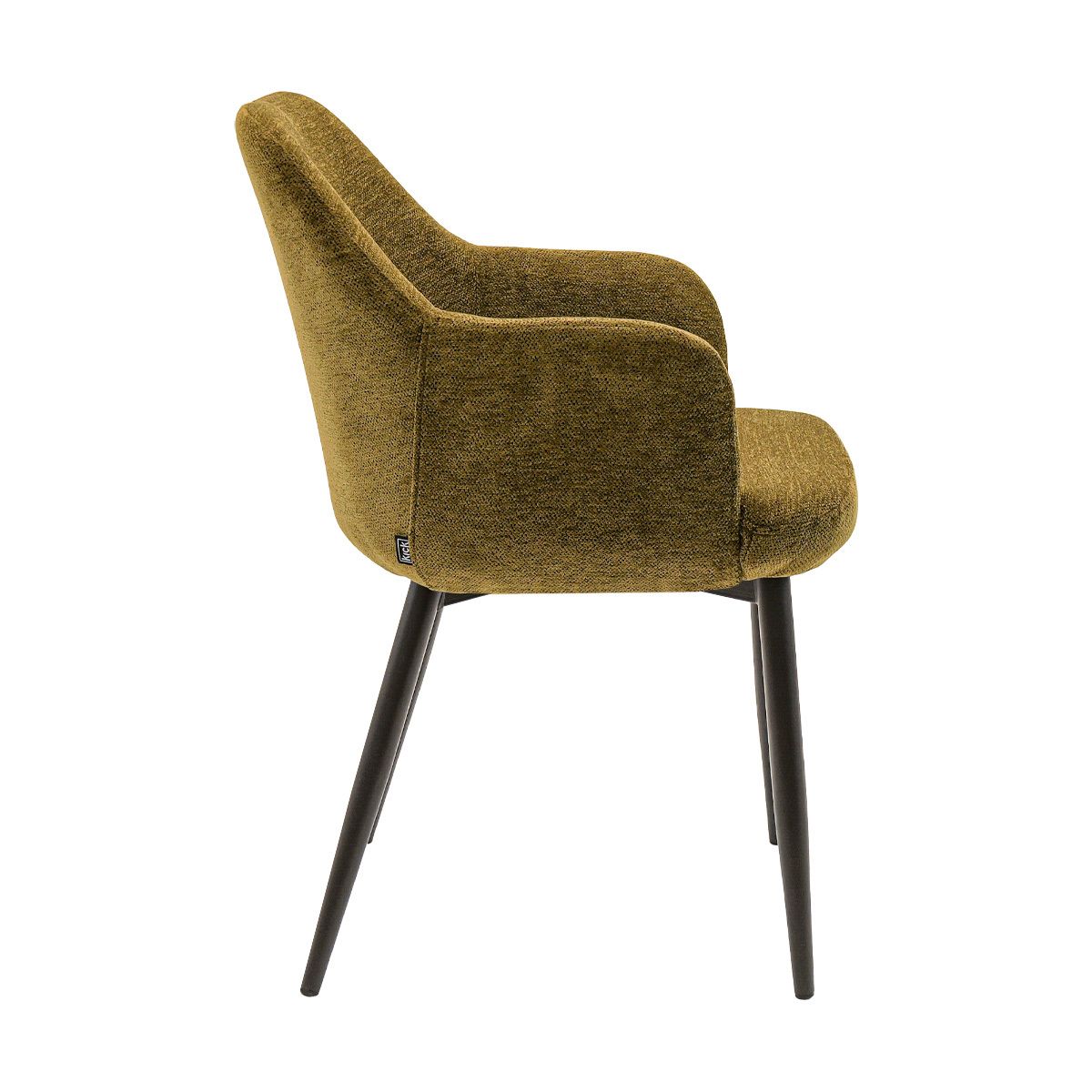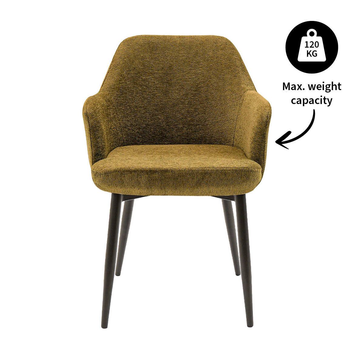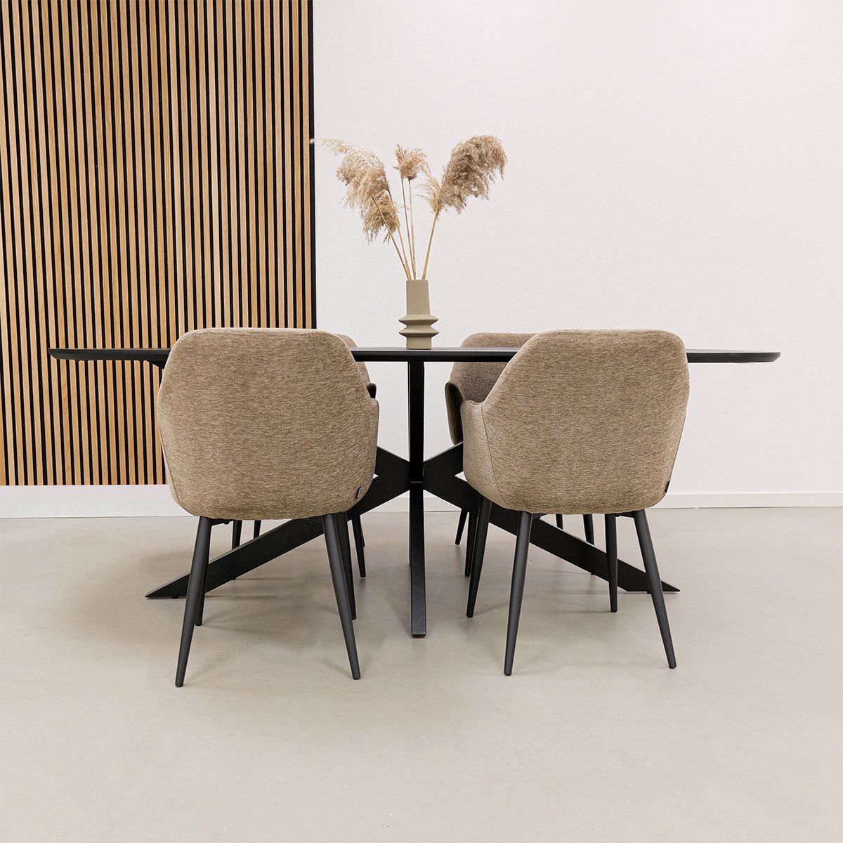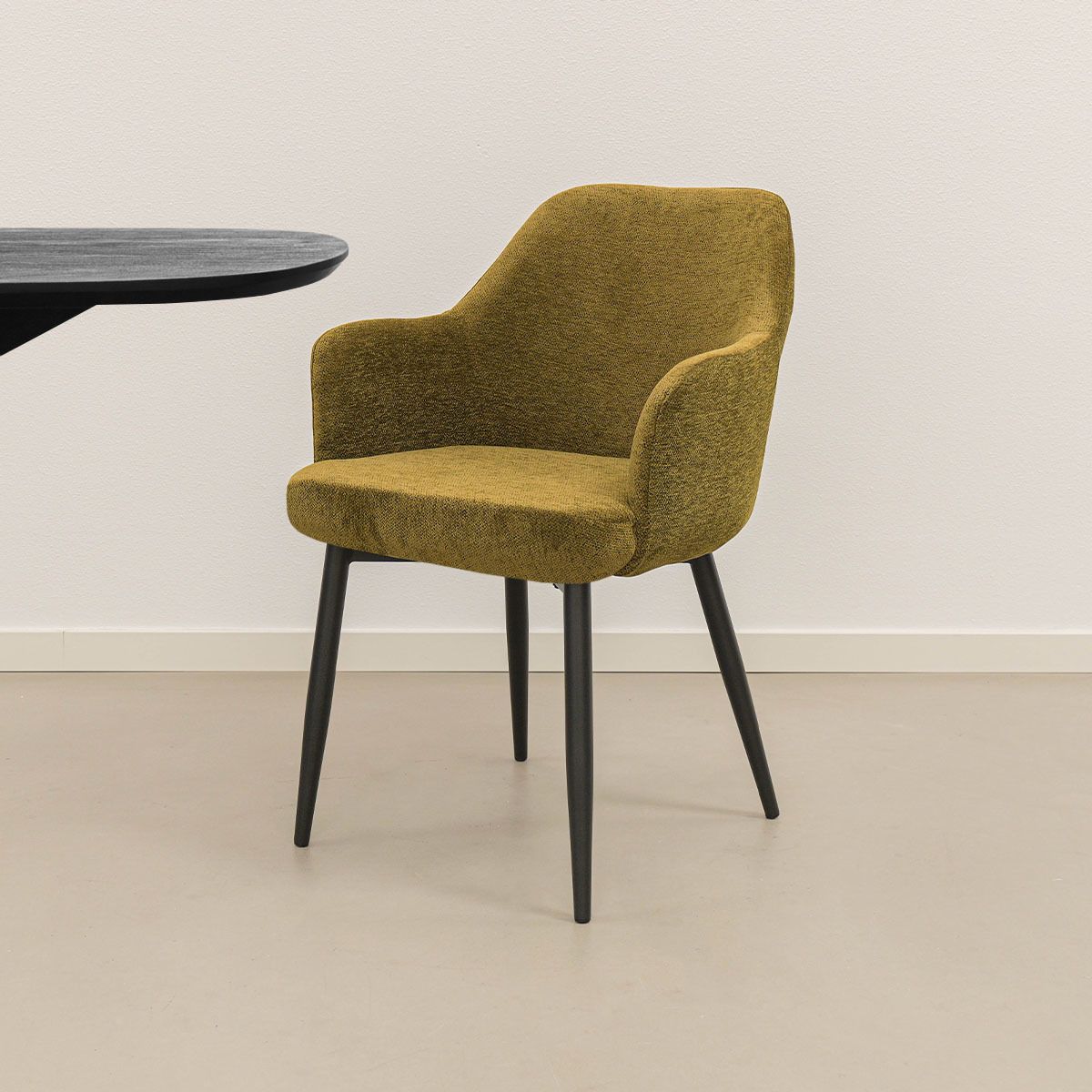 The soft textured fabric feels pleasant to the touch and gives JODI a luxurious, inviting look. Thanks to the spacious, comfortable seat and the finely shaped armrests, you will always sit relaxed, even during long dinners. The metal base with a matt black finish provides a bold contrast and completes the sleek design. JODI is available in different colours, allowing it to effortlessly match your interior style.