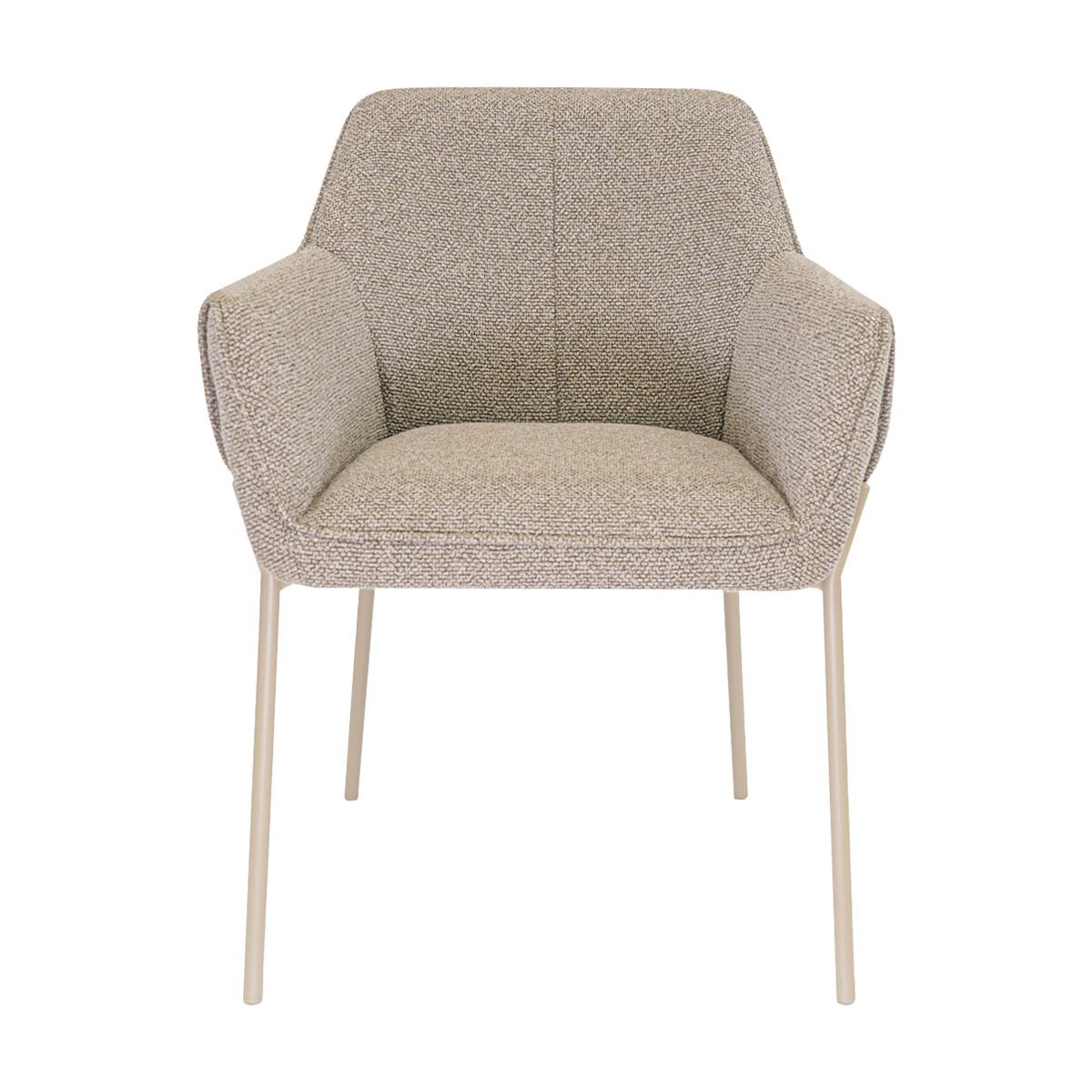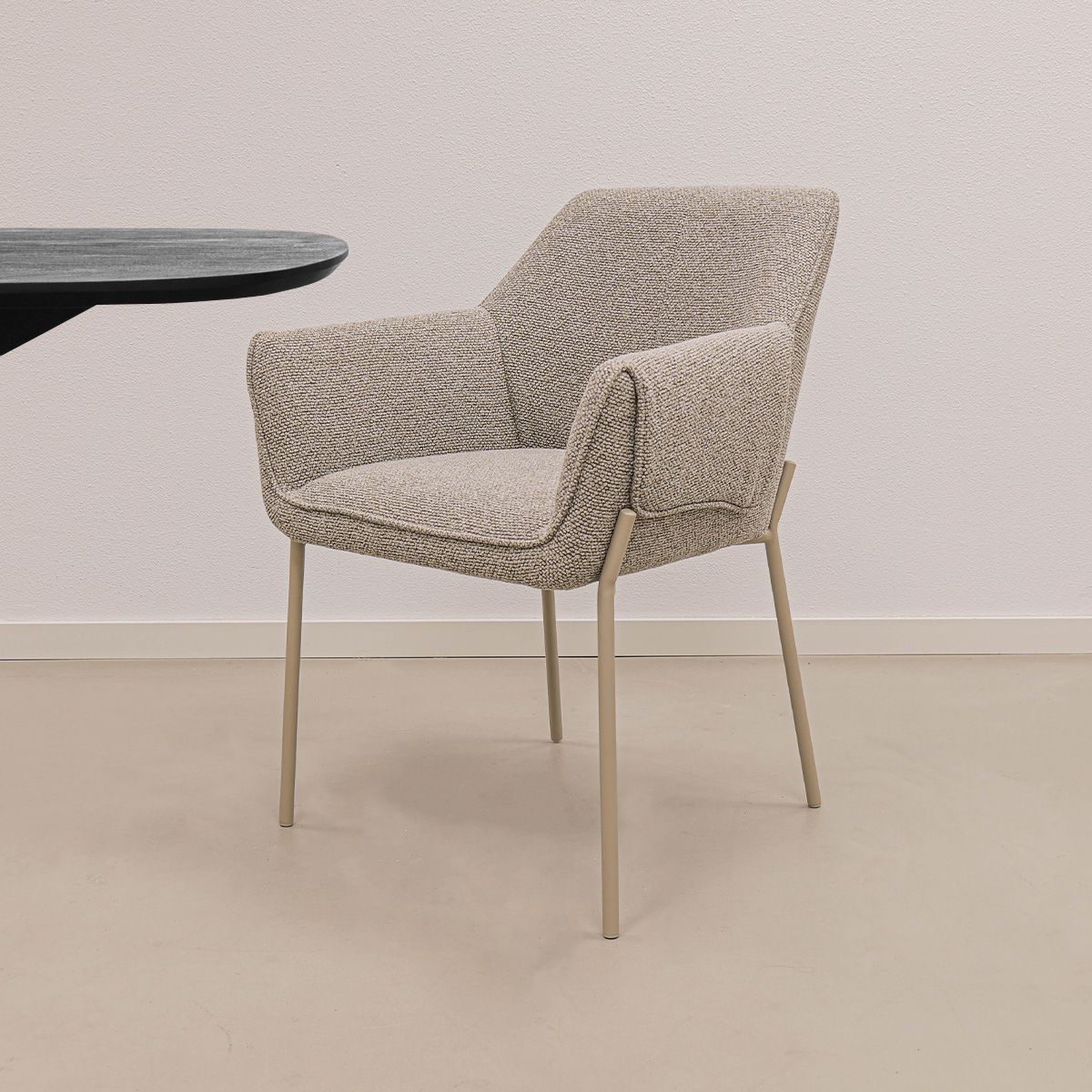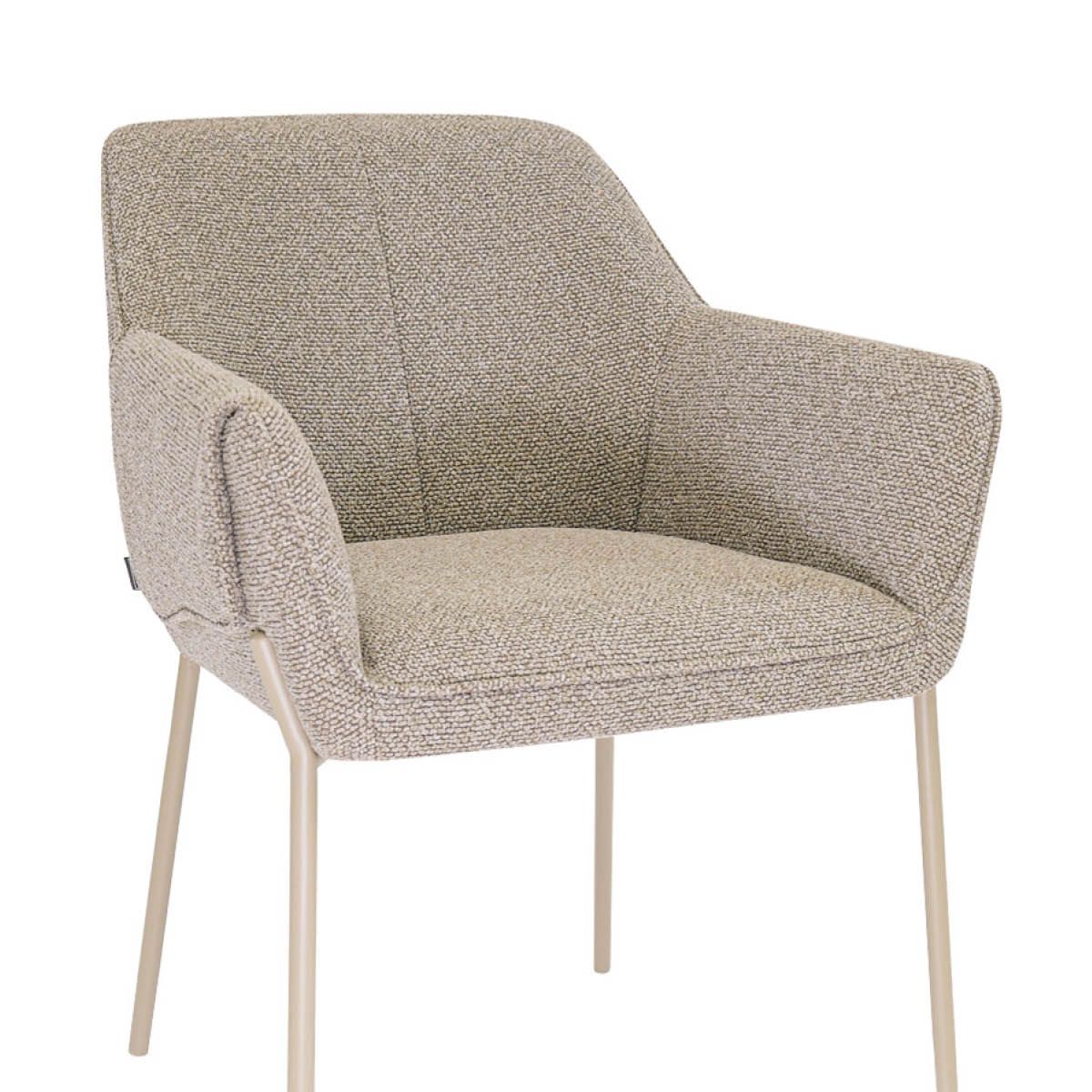 The comfortable armrests provide excellent support during long dinners. The sleek design, combined with the unique wrap-around armrests, gives the chair a bold character, while the soft texture of the fabric and the refined stitching in the backrest create an elegant and luxurious look. The comfortable backrest contributes to pleasant seating comfort, perfect for cosy evenings at the table.
