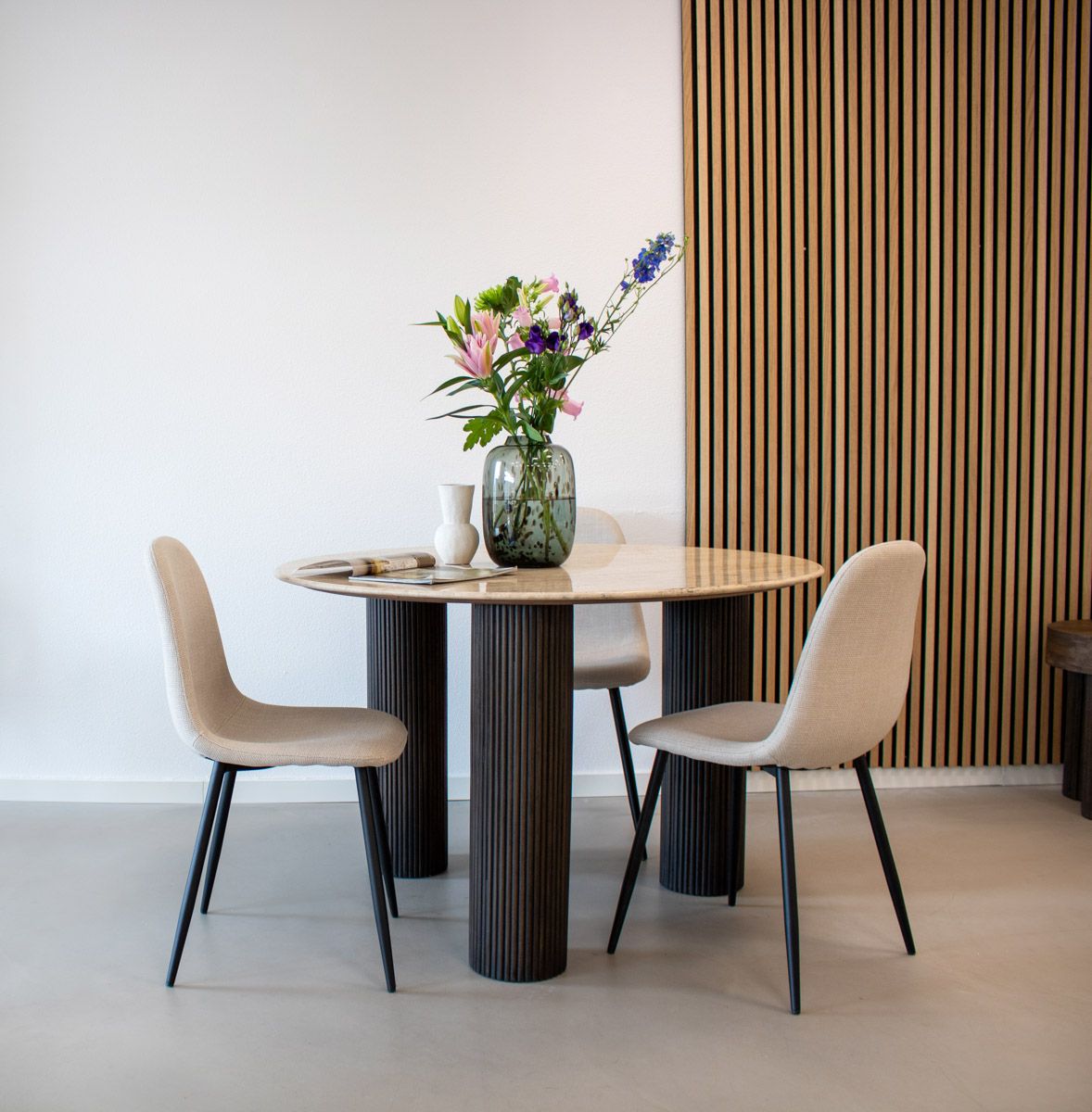 MEET NOOR! Dining chair NOOR is a comfortable chair upholstered in a cool texture fabric. The frame is made of metal and finished in black. The dining chair NOOR fits in every interior and is available in various trendy colours. Mix & match for the ultimate Kick result!