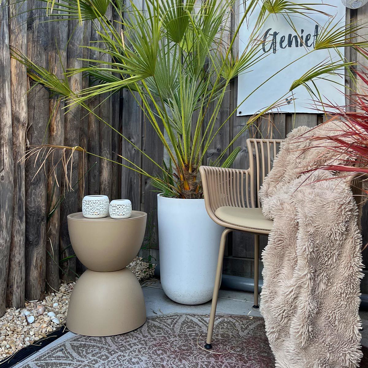 The side table is made from sturdy plastic and features a special outdoor coating. This means you can use TESS both indoors and outdoors, enjoying a low-maintenance and durable piece of furniture. Ideal for sunny afternoons in the garden, cosy drinks on the terrace or as a practical little table next to the sofa.