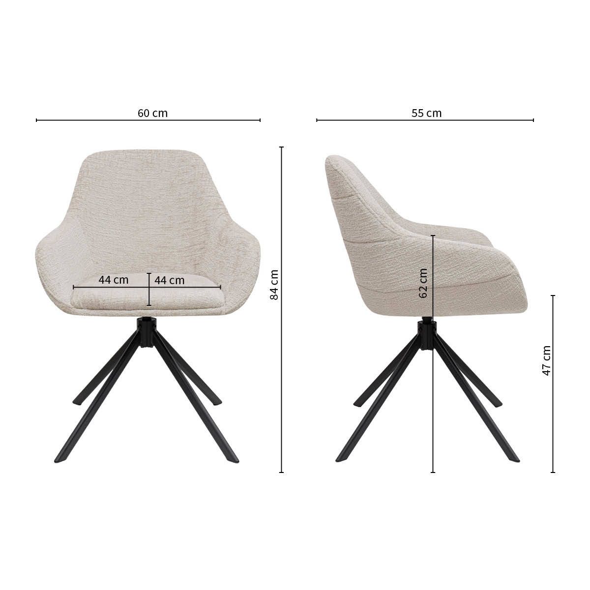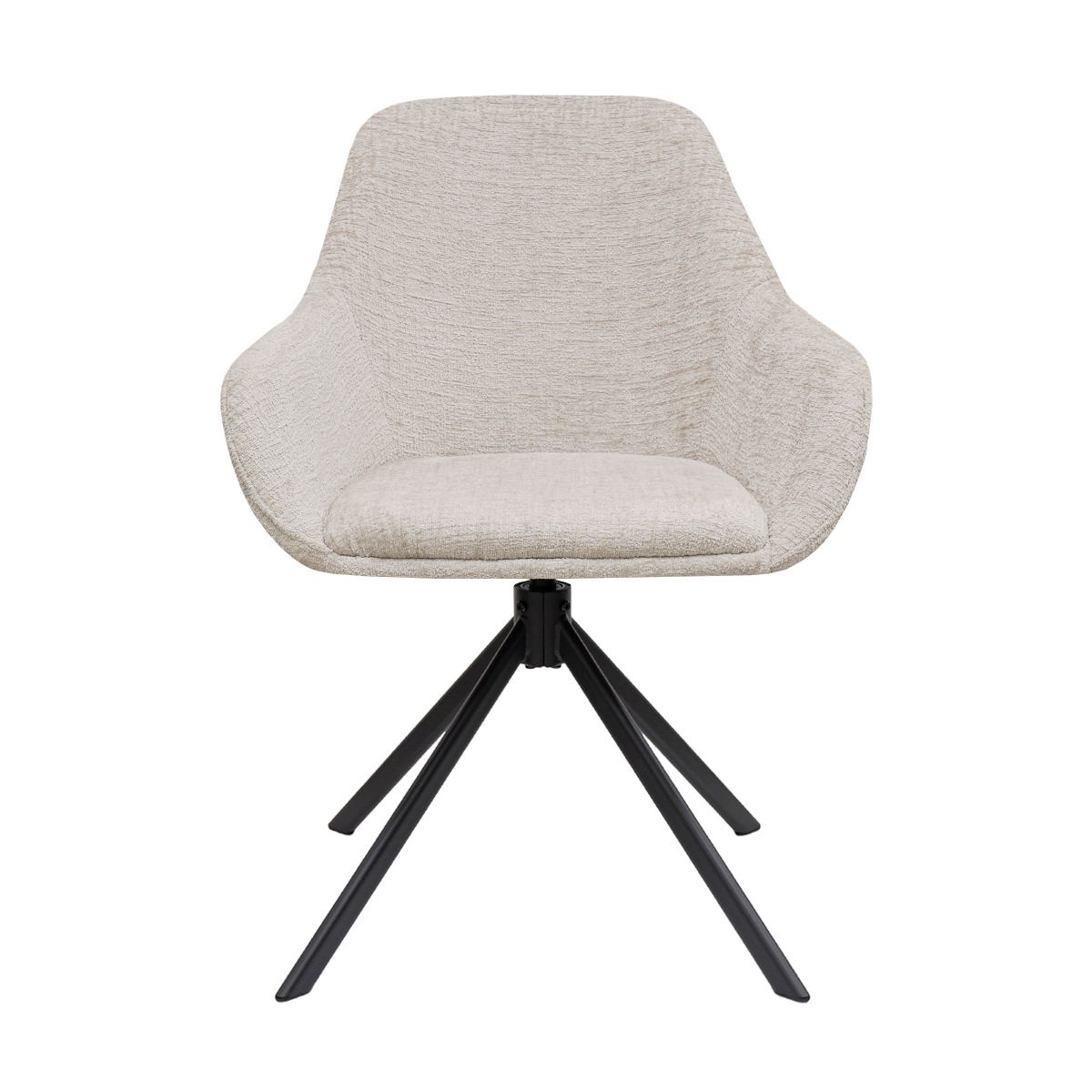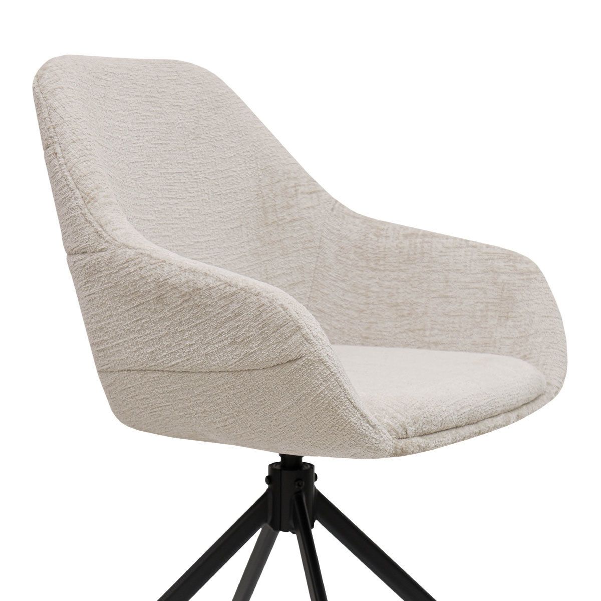 The soft textured fabric gives JULE a luxurious look, while the metal base provides a sleek and stable foundation. The horizontal stitching in the backrest is a subtle yet striking detail, giving the chair a playful and refined character. Thanks to the 360-degree swivel function with automatic return, you can enjoy extra freedom of movement, while the comfortable armrests ensure a relaxed seating experience.