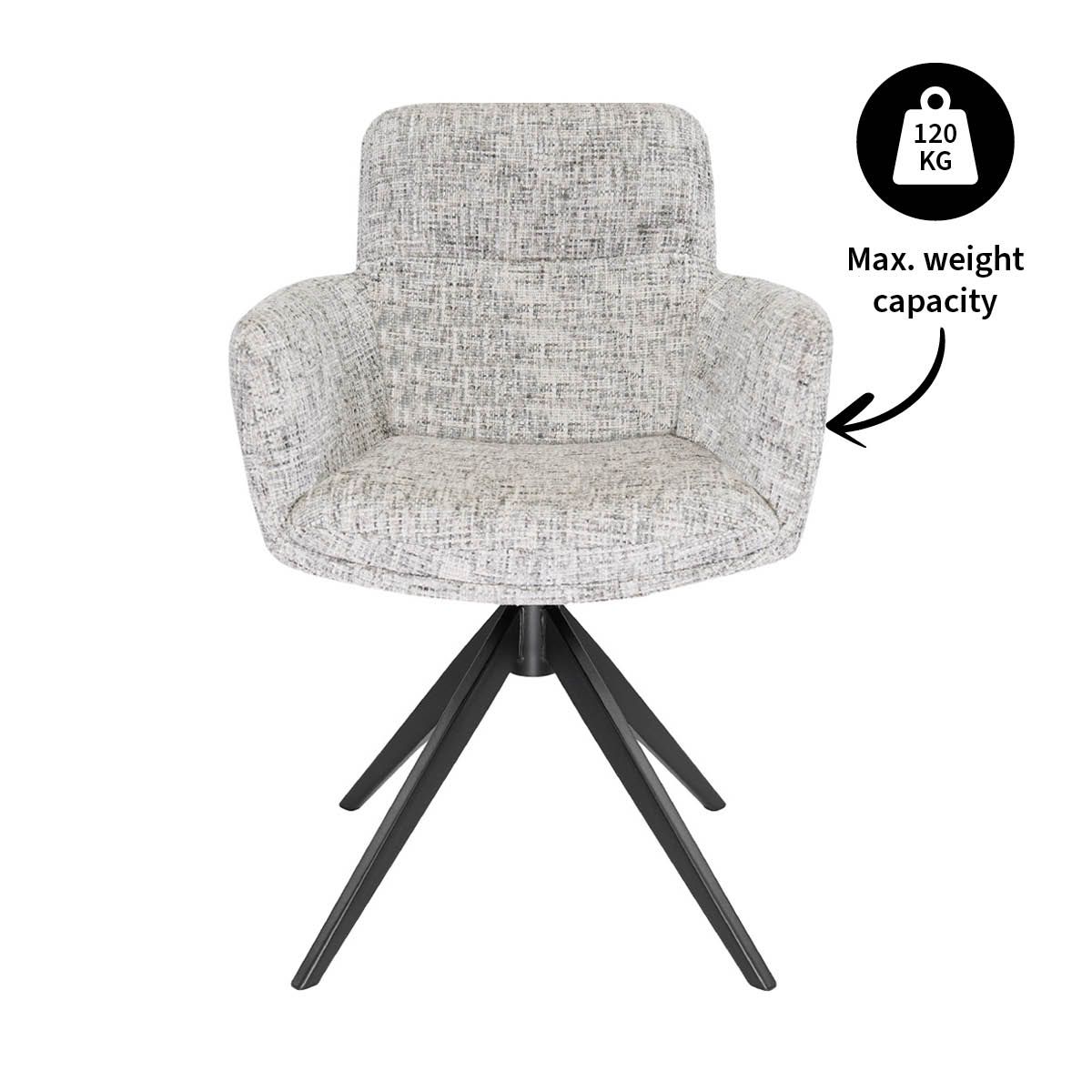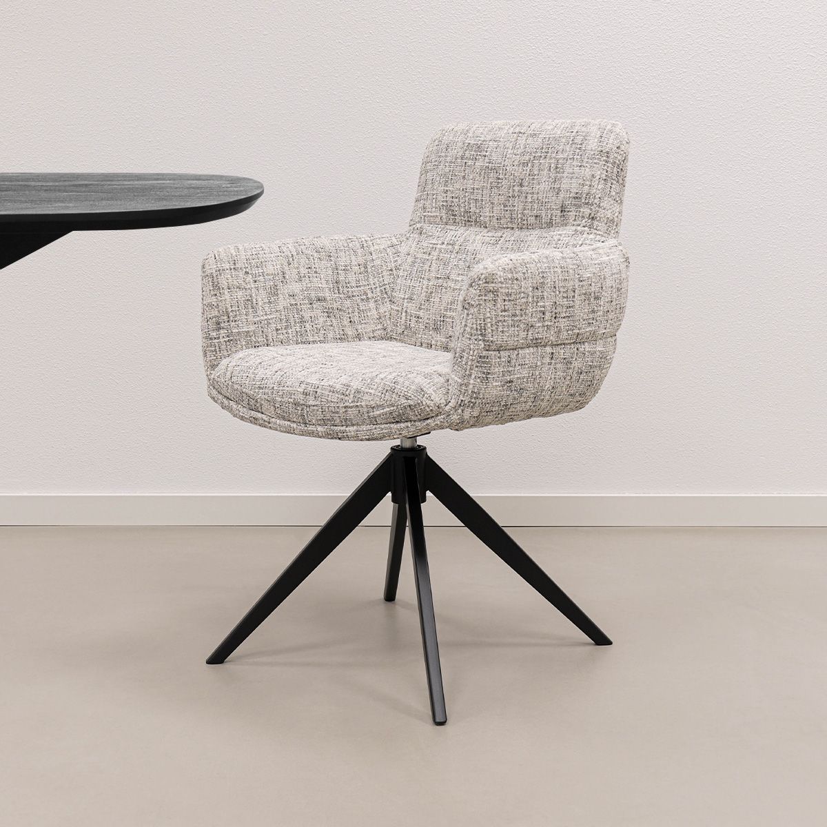 Thanks to the full seat padding, comfortable backrest and supportive armrests, you'll always be sitting comfortably — whether you're enjoying a long meal or spending a working day at home. The 360-degree swivel base with automatic return function provides extra convenience, while the black metal base forms a modern and luxurious foundation.