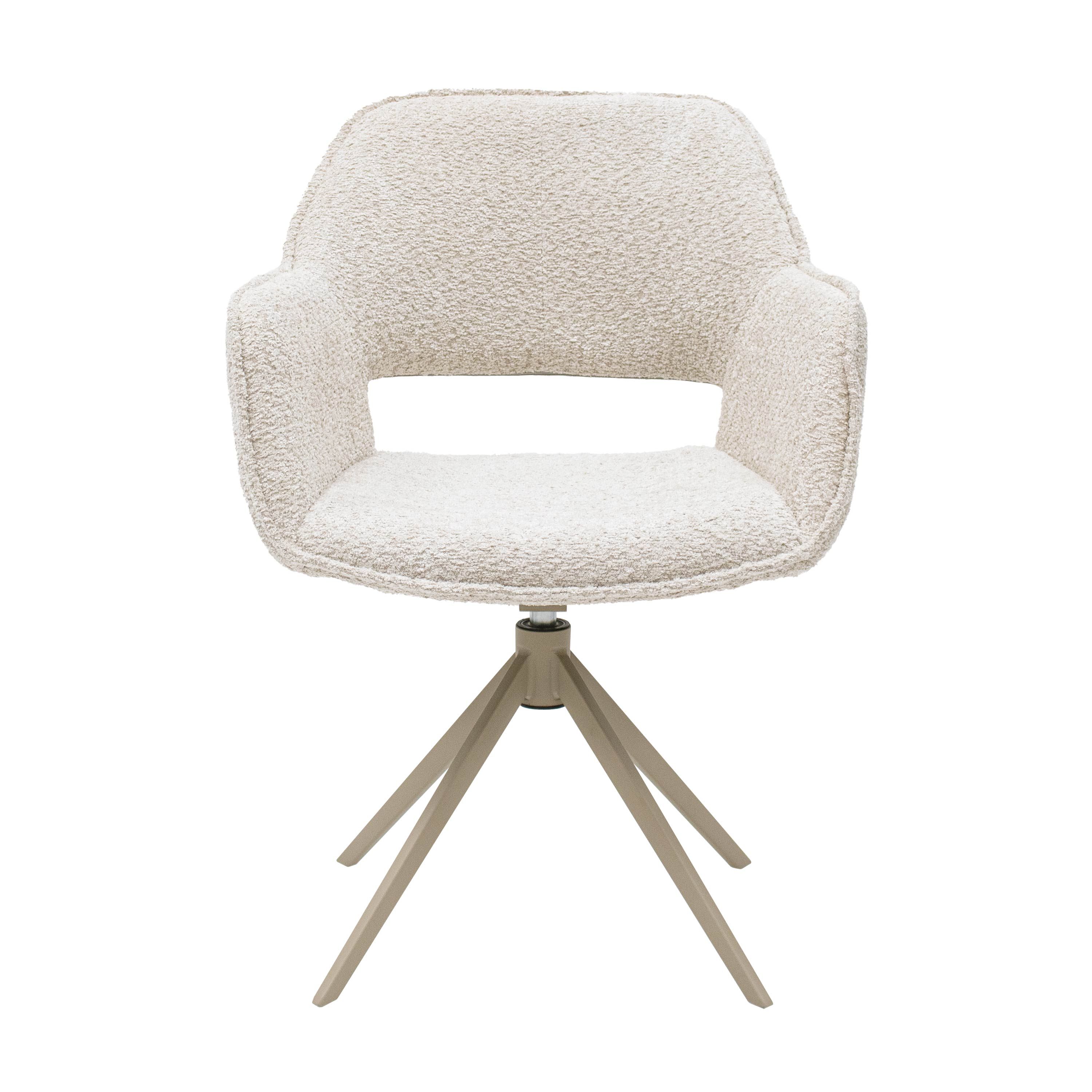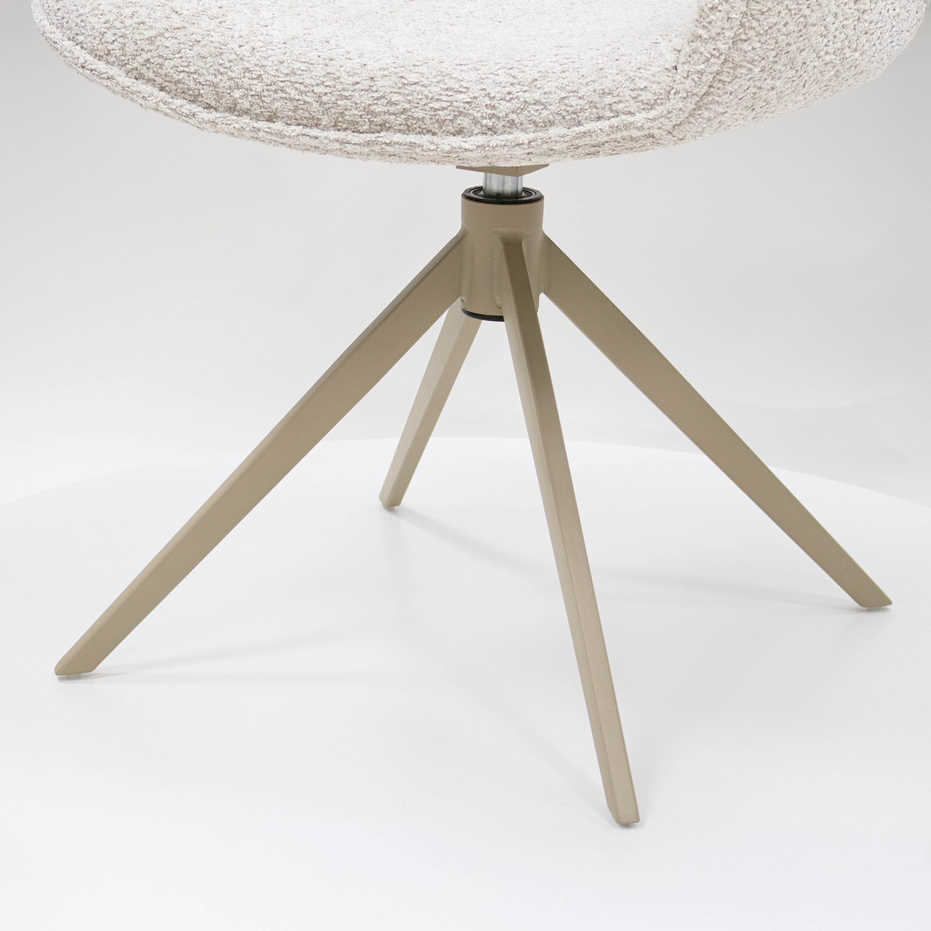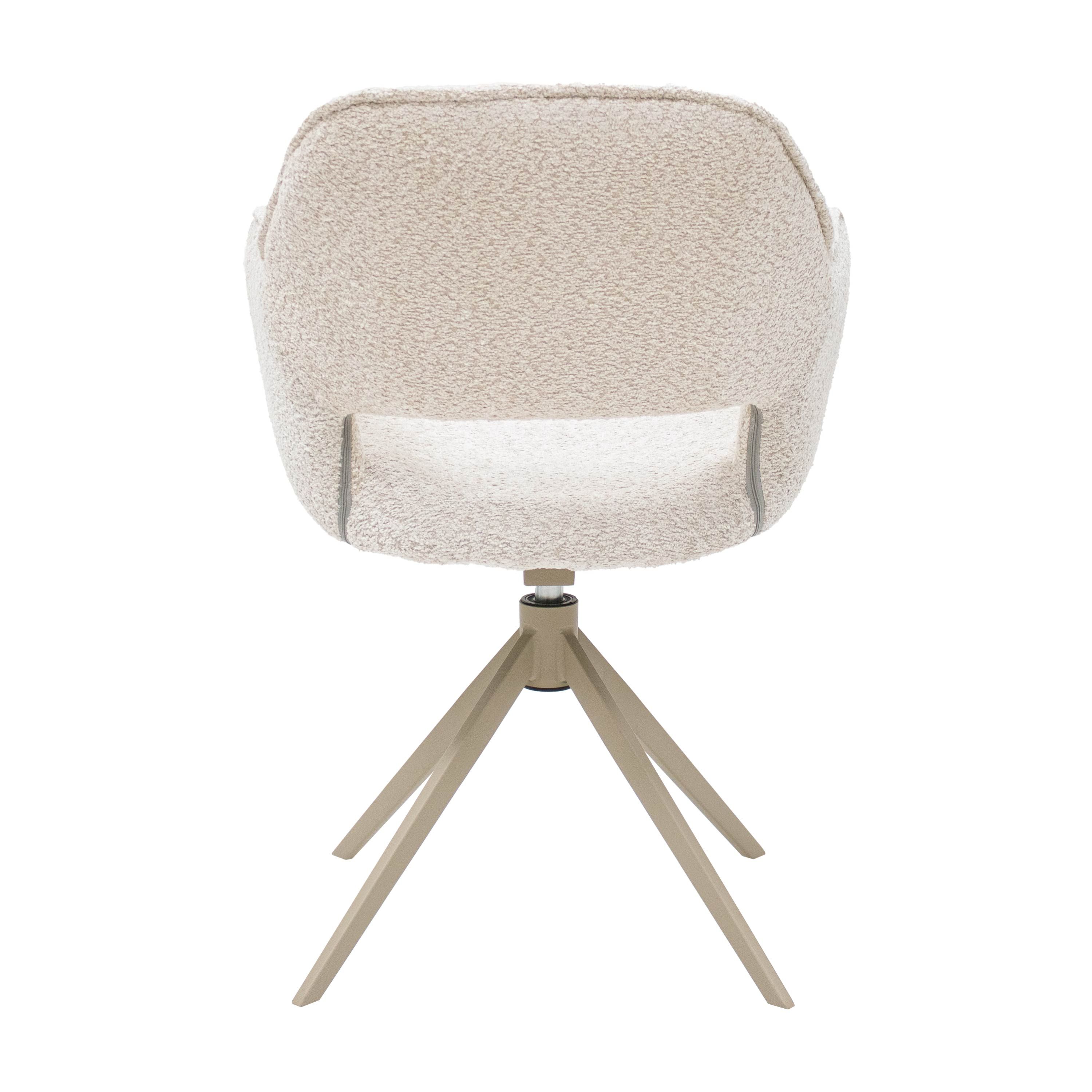 MEET OWEN! Swivel chair Owen is upholstered in a beautiful soft bouclé fabric, features a fine armrest and has an opening in the back. Its metal base and 360-degree swivel frame, which automatically returns to its original position, combine style with ease of use. Owen is available in a variety of colors!