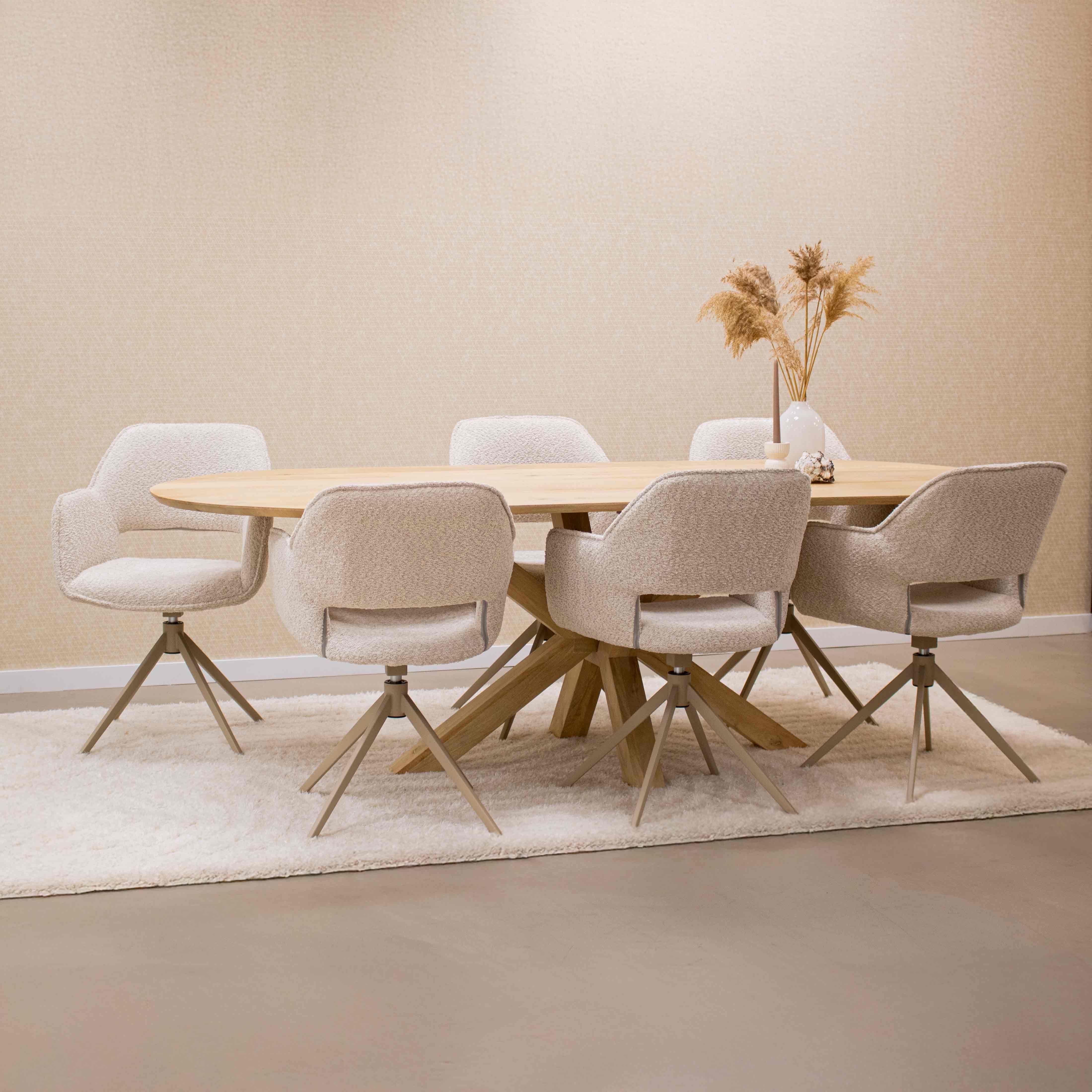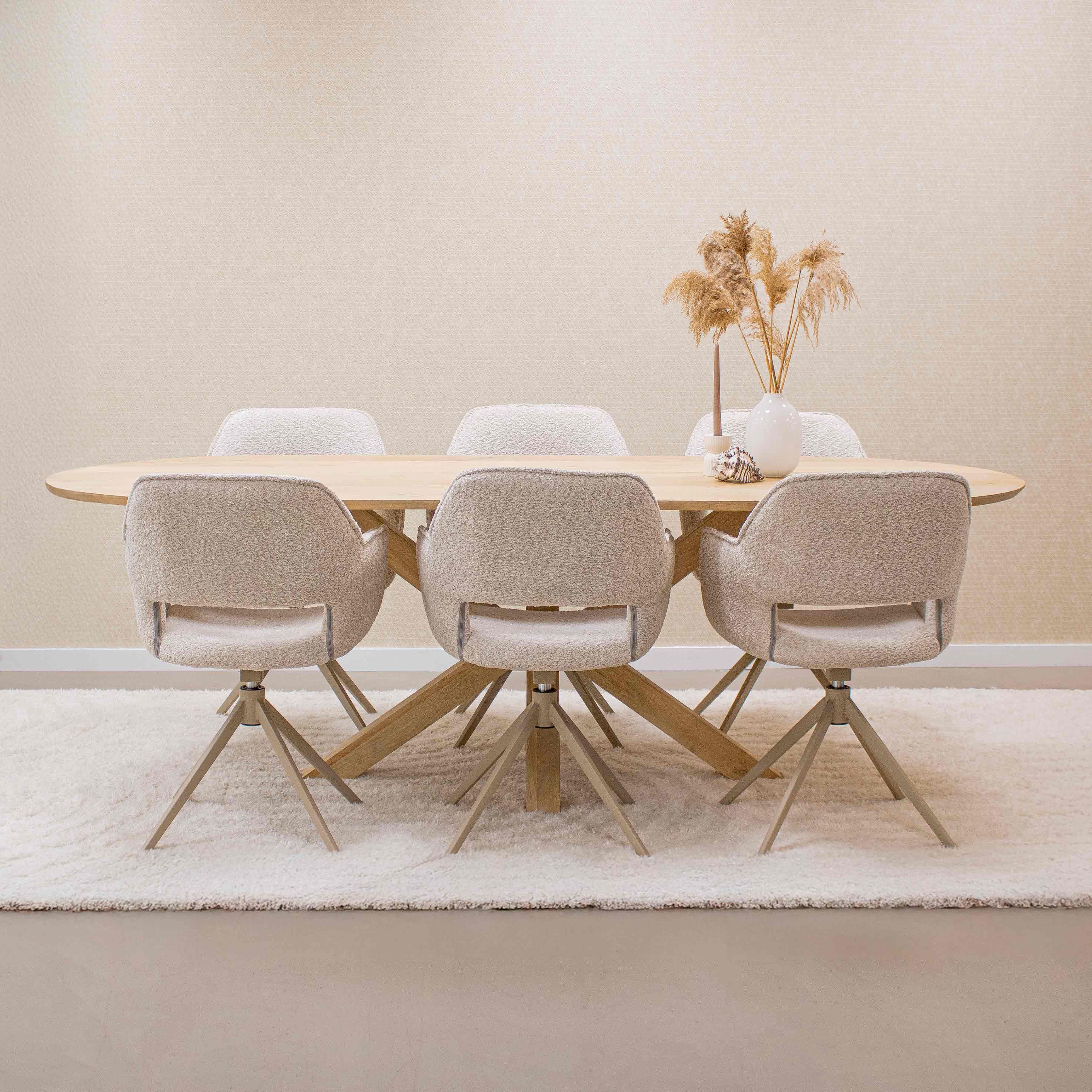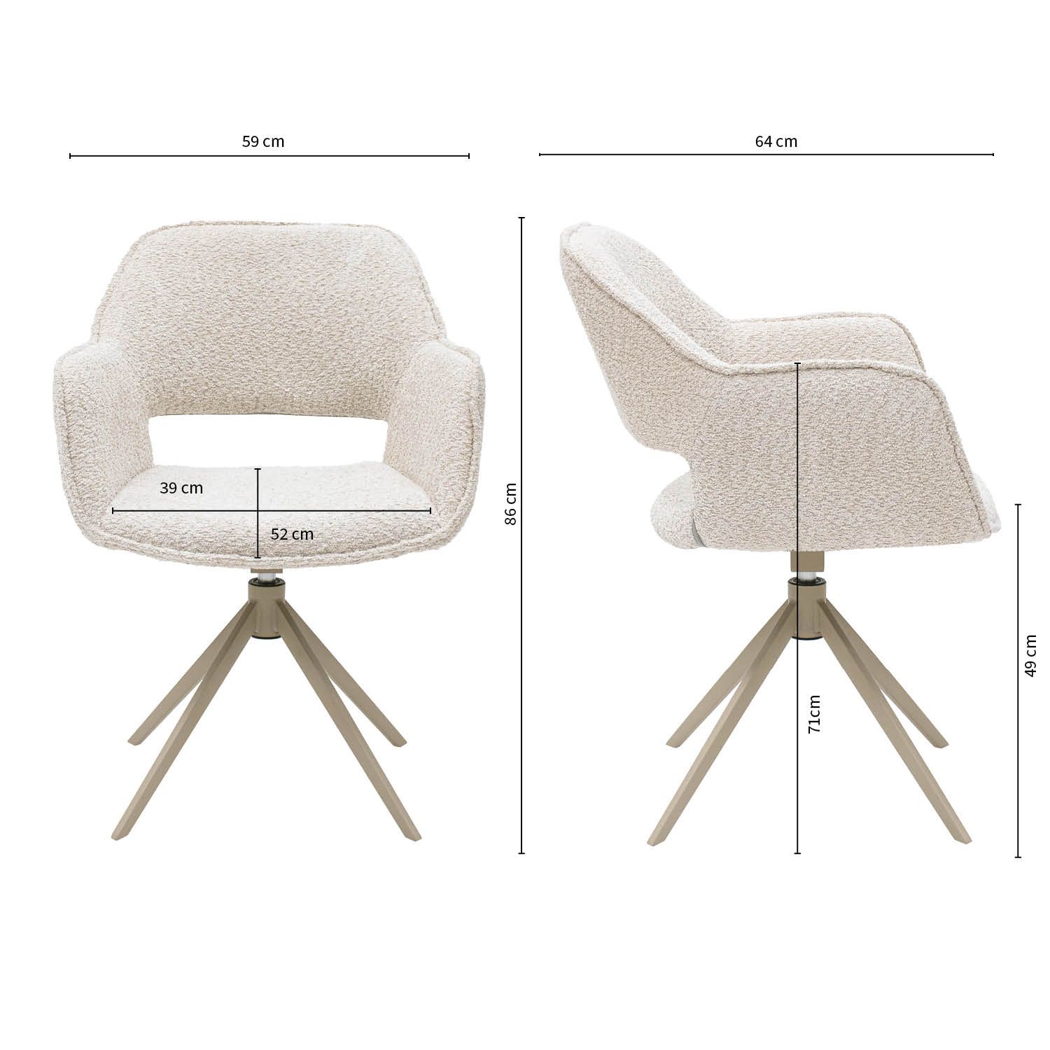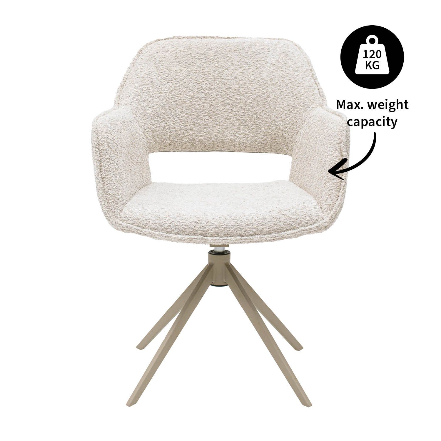 MEET OWEN! Swivel chair Owen is upholstered in a beautiful soft bouclé fabric, features a fine armrest and has an opening in the back. Its metal base and 360-degree swivel frame, which automatically returns to its original position, combine style with ease of use. Owen is available in a variety of colors!