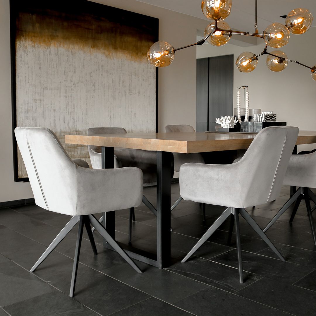 TOM is the ideal swivel chair for anyone who values comfort and style. With its 360-degree swivel base, this swivel dining chair offers ultimate ease of use: simply slide in and out of the table without having to move your chair. Thanks to the comfortable seat and armrests, you can effortlessly enjoy long dinners, cozy drinks, or a productive workday.