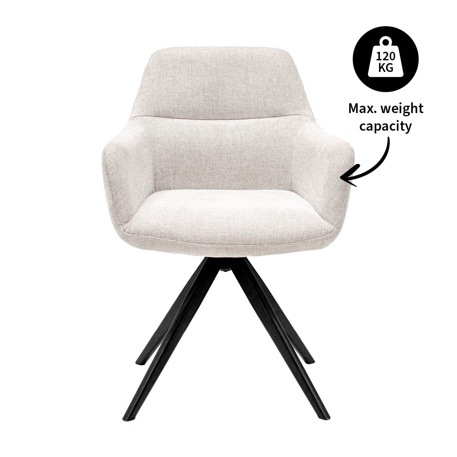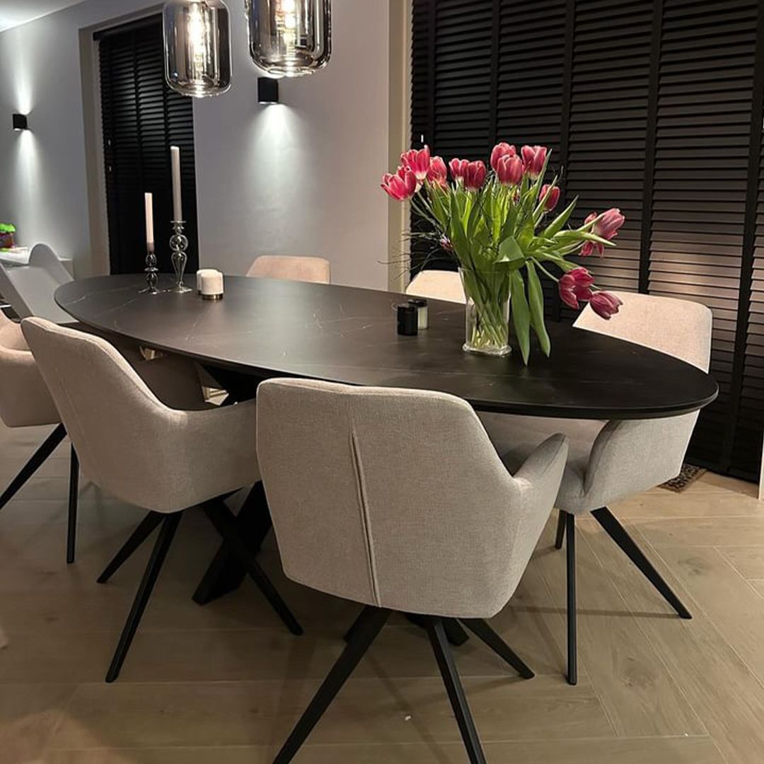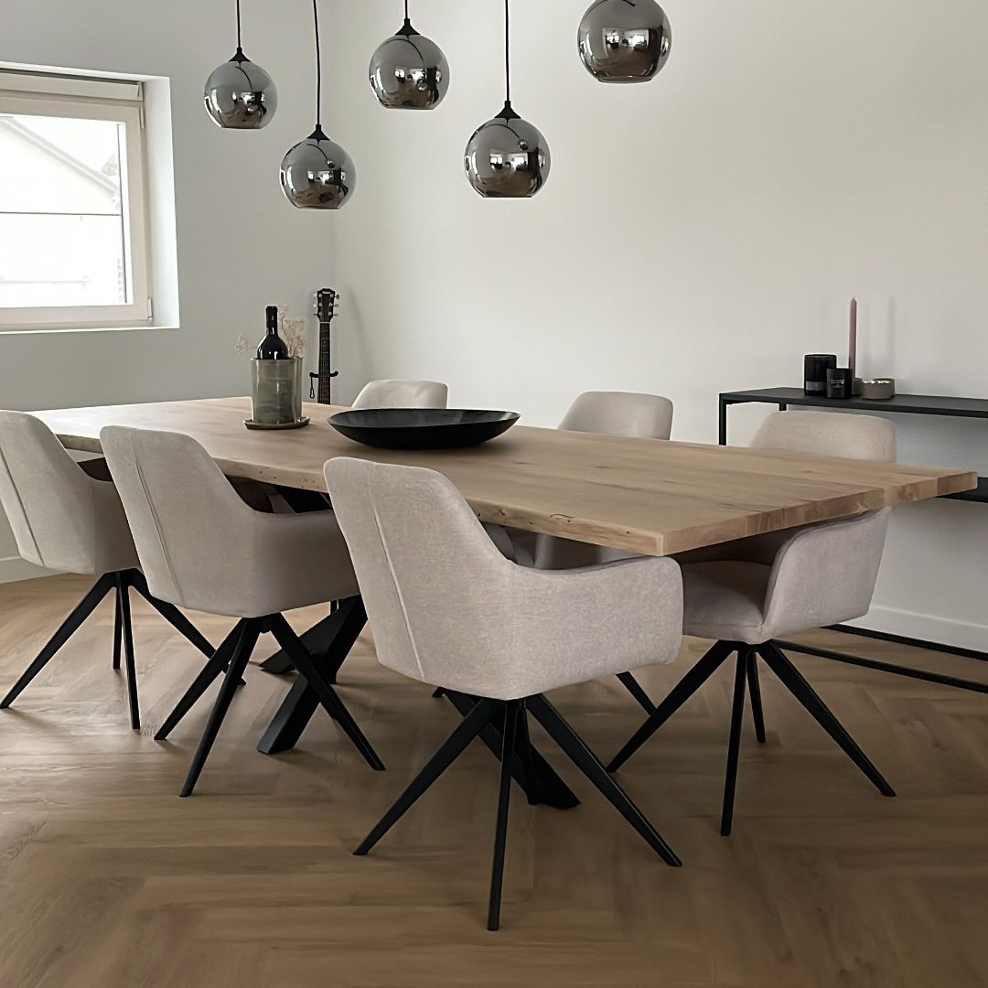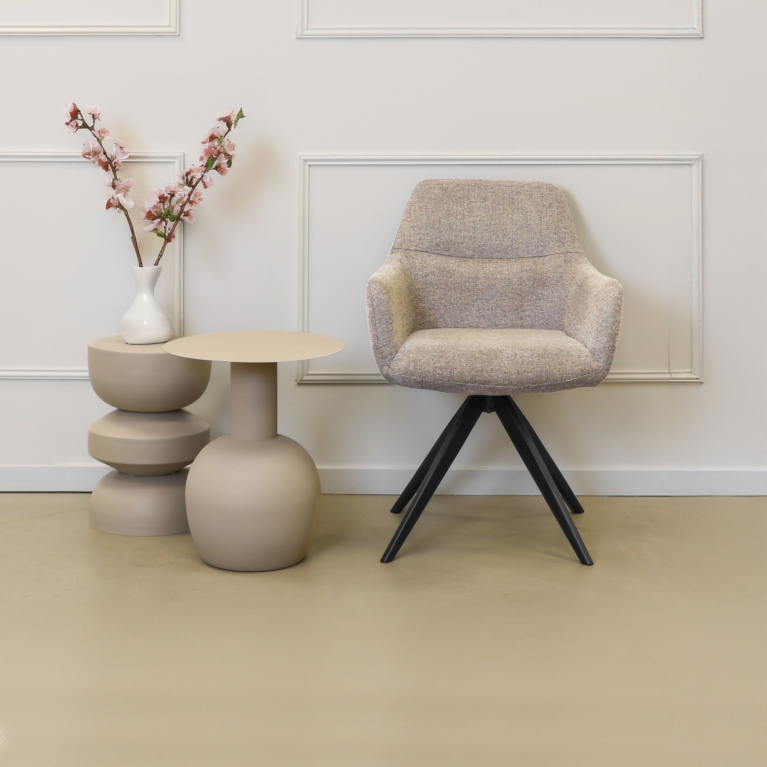 TOM is the ideal swivel chair for anyone who values comfort and style. With its 360-degree swivel base, this swivel dining chair offers ultimate ease of use: simply slide in and out of the table without having to move your chair. Thanks to the comfortable seat and armrests, you can effortlessly enjoy long dinners, cozy drinks, or a productive workday.