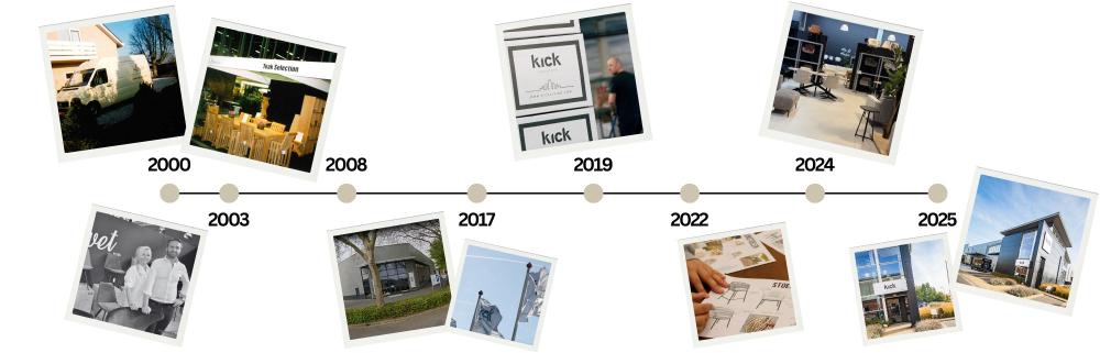 In 2000 zijn we begonnen met het op de markt brengen van hoogwaardige teakhouten meubels. Onze klanten reageerde positief op onze producten en al snel werd er uitgebreid naar design eetkamerstoelen en werden wij trendsetter met onze velvet stoelen. Inmiddels zijn we 2 keer verhuisd naar een groter pand en magazijn waardoor we nu een ruimte hebben van 10.000 m2 met daarbij onze eigen showroom. Het hebben van een eigen klantenserviceteam, marketingteam en designteam maakt Kick compleet als professionele partij in de interieurbrance.